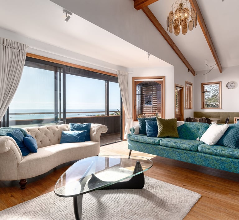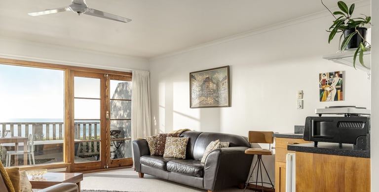 Boasting views of the ocean, this three-bedroom cottage features polished concrete floors in the open plan kitchen, living and dining areas.