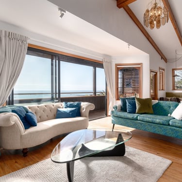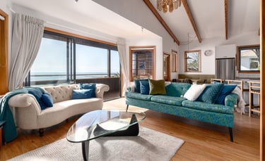 The Gallery has two generous bedrooms on the ground floor with a large bathroom including a shower and standalone bath. There is a laundry with a washing machine and dryer and a single garage for storing bikes and equipment if needed. The atmosphere in the Gallery is unique with open vault ceilings and exposed beams, concrete bench tops, wooden floors, leadlight windows and large opening sliding doors out to an internal veranda. You will be mesmerized by the seascape and the view of where the mountains meet the sea.