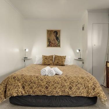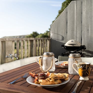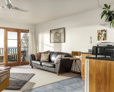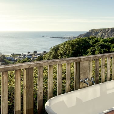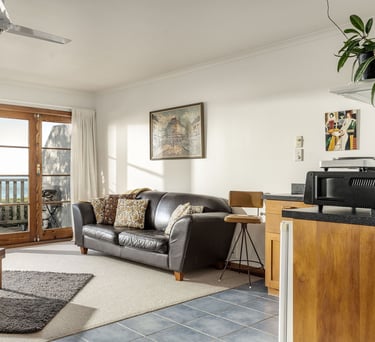 Boasting ocean and mountain views with a large claw-foot bathtub on the private deck, this spacious studio apartment includes a separated bedroom area with a king size bed, inside bathroom with a shower, vanity and toilet and a living area with comfortable couches and a dining area. The kitchenette has a fridge, microwave, two hot plates an air fryer oven and everything you need to cook and eat with. The Weber BBQ on the deck can also be used as an outdoor